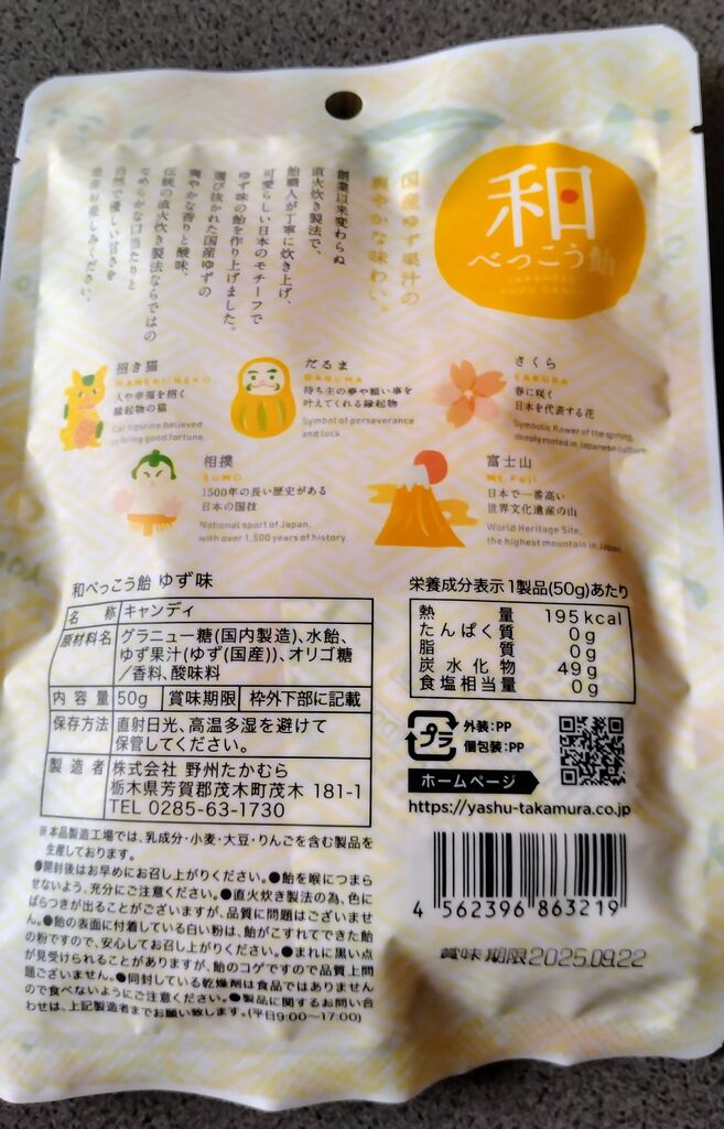 「べっこう飴 和」を購入しました。だるま・桜の花・富士山・招き猫などを形どった飴が一つずつ包装されています。優しくて、どこか懐かしさが感じられる甘さです。和風の文化も感じることができる飴の逸品だと思います。 (訪問:2020/04/17)