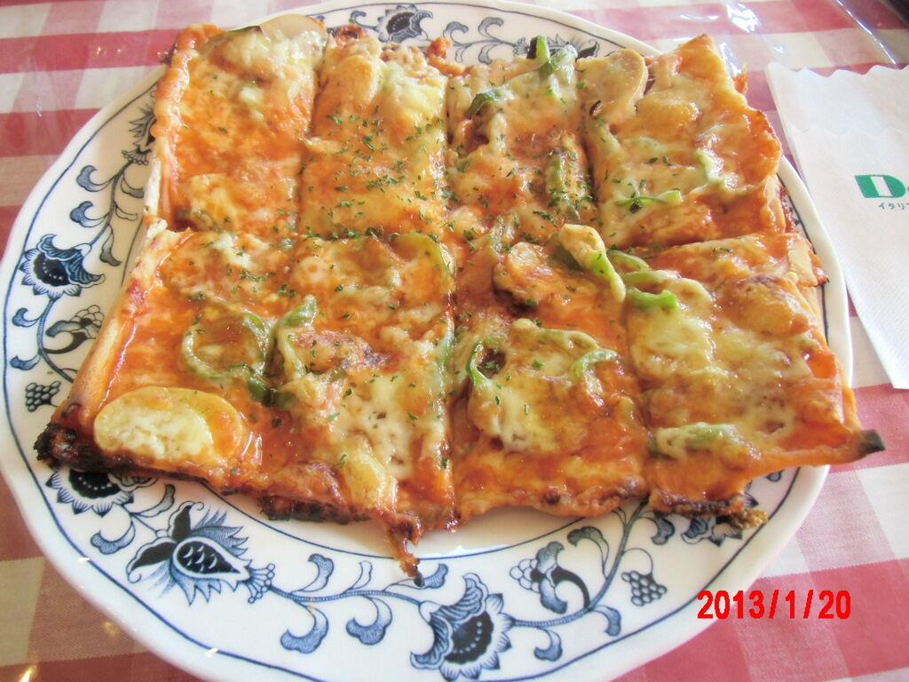 店内はどちらかといえばカジュアルな雰囲気なので、私でも臆する事無く伺えました。この日のお客さんの割合も、ファミリ-とカップルが半々くらいでしたね。パスタやドリア、ピラフ等もありましたがピザを注文。こちらのピザはベ-スのピザ(具なし¥550)に自分で好みのトッピングを追加するシステム。今回手っ取り早くミックスで注文しました。運ばれてきたピザを見て暫しフリ-ズ!当然丸い物と思ってましたが、四角いピザが登場!生地は薄めでどちらかといえばパリパリの生地。最近はモッチリした生地のピザばかり食べていたので久し振りの食感。ミックスのトッピングは+¥200でリ-ズナブルですが、サラミやピ-マン、マッシュル-ム等が入っていてこれだけで全然十分です。 (訪問:2013/01)