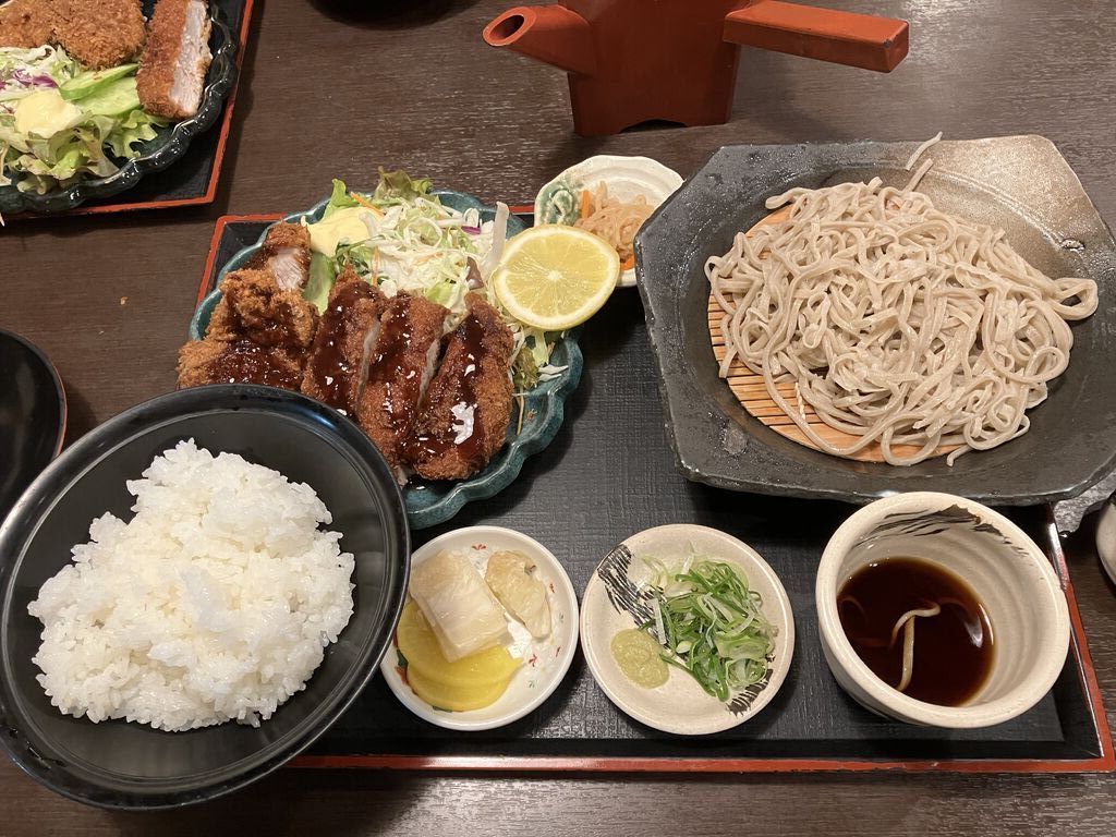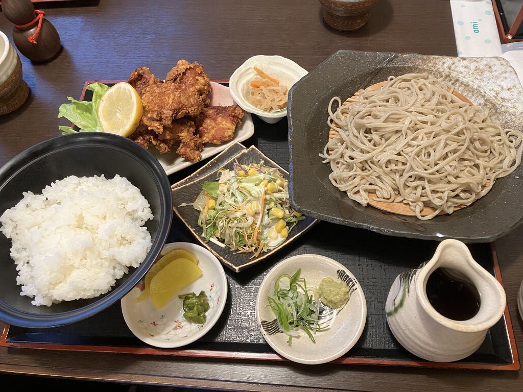 初めて4人でランチ訪問しました。私はとろろセットを。とろろ、たぬき蕎麦(うどんでも大丈夫)、サラダ、香の物、白飯がセットになっています。混んでいたので提供までは待ちました。運ばれたセットはお洒落で見ただけで食が湧きます。喉越しが良いお蕎麦や卵とあおさ粉を混ぜて白飯にたっぷりかけて頂くと、極旨であっという間に完食です。食べきれなかった母が頼んだお蕎麦もお手伝いしました。同行の息子が頼んだ唐揚げセットも美味しそうで写真を撮りました。初めての訪問ですっかりお気に入りに。次回は何を頼むか今から楽しみです。 (訪問:2025/08/17)