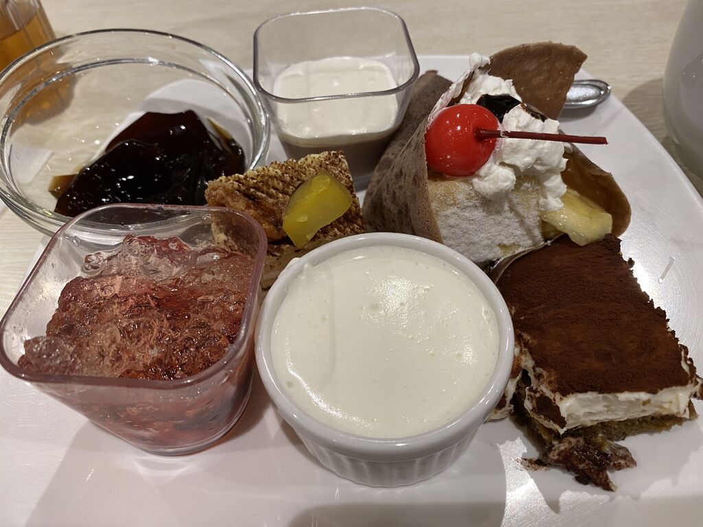 ランチ訪問。11月末までアジアンフェアです。パッタイ、ビビンバ炒飯、ガパオライス、北京ダックの皮、台湾カステラ等、他にも色々なアジアンメニューがありました。サラダコーナーには、ディップが出来るソースも数種類ありました。種類豊富なスイーツは、楽しめるコーナーで、クレープも作れます。平日ランチにシルバー料金で、クーポンを使い¥1,254でゆっくりランチを楽しめました。 (訪問:2025/11/05)