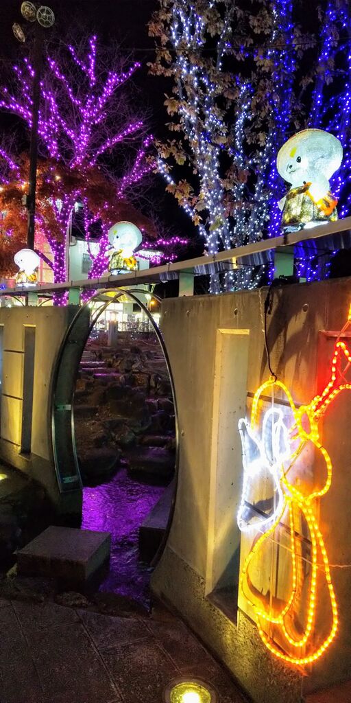 ぱるぽーとと駅前ロータリーをひっくるめてのイルミネーションであります。駅を利用する人、お迎えに来る人、駅を通る人、わざわざ見に来る人など皆さんの注目の的でありました。コチラは何といってもゆるキャラグランプリ日本一のさのまるが主役であります。木々などのカラフルな点灯に囲まれた中でアチラコチラで光輝くさのまる坊やが見受けられ可愛さが倍増しておりました。クリスマス仕様が多い中で佐野市らしいイルミネーションを見る事が出来ました。 (訪問:2021/12/04)