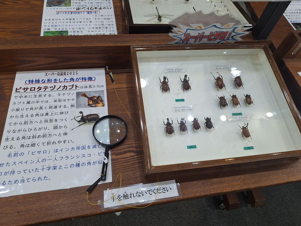 子どもと、秋の企画展「スーパー昆虫大集合」を見に行きました☆ポスターのジンメンカメムシのように見た目がインパクトのある昆虫や、生態がバラエティーに富んだ、特徴的な昆虫が集めてられていて面白かったです♪大好きなギラファノコギリクワガタも、初めて見るピサロタテヅノカブトもずらりと標本があり、もちろん触れる生体もありました。時々HPをチェックしているのですが、「大田原市在住の方よりカブトムシの幼虫を提供して頂きました。育ててみたい方は自然観察館まで」と掲載されていたので、欲しいです!と申し出ると、後日いただける事になり、嬉しかったです。再訪確定です(^ー^) (訪問:2025/09/23)