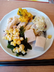 夫が休みだったのでお昼を食べに行く事になりました。ここのお店はメインを頼むとお惣菜バイキングがつくので気に入っています。今は野菜も高いので栄養が沢山とれる気がします。今の時代にご飯もお替りできるのも魅力です。本日は惣菜バイキングだけの定食にしました。あまり食べられなさそうな時に選びます。 (訪問:2025/09/30)