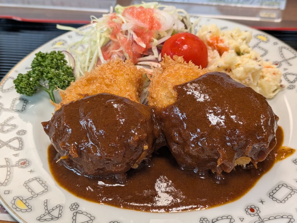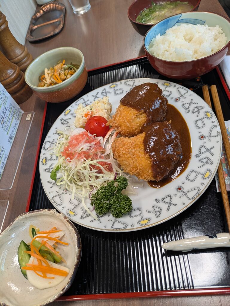 遅めのお昼ごはんをいただきに、神様と一緒に伺いました。残念ながら、お得なランチメニューは終了してしまったとのこと…。気を取り直して、豊富なメニューの中から、私は「海老クリームコロッケ定食1400円」を、神様は「ハンバーグ定食1100円」をいただきました。運ばれてきた御膳は、想像以上のボリュームでびっくり!メインの海老クリームコロッケの他にも、野菜たっぷりのおかずがずらりと並びます。まずはお味噌汁をひと口。こちらも具沢山で、これだけでお腹が満たされます。海老クリームコロッケは、お箸でサクサクの衣を破ると、とろとろのホワイトソースがたっぷり。プリッとした海老が入っていて、かなり食べ応えあります。野菜のおかずも優しい味付けで、お腹いっぱい食べても罪悪感を感じません。次回はレディースランチをいただいてみたいです。美味しい幸せをありがとうございました!ごちそうさまでした〜。 (訪問:2022/10/10)