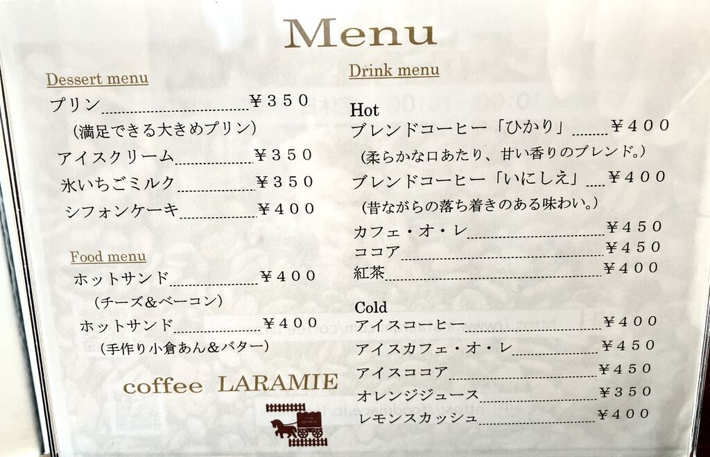 小さな田舎町に素敵な喫茶カフェを探しました。お店の雰囲気最高❣・・西部劇ララミー牧場を感じさせる。駐車場の塀と幌馬車。落ち着いてコーヒーを味わえる明るい素敵な店内。大きいプリンはホロ苦さのある本格的なプリンで実に美味しい。ベーコンとチーズのサンドイッチも、とても美味しかった。最初に写真に写す予定が美味しそうで先に食べちゃいました。絶対、またララミーにお邪魔します。 (訪問:2023/03/23)