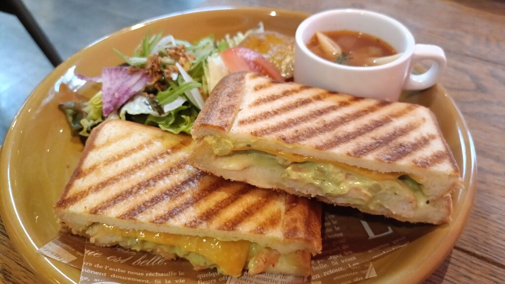 ホットサンドが食べたくて探していたら発見したお店~初訪問٩( ᐛ )و駐車場満車でビックリ(Ꙭ )!!人気店だった店内も満室(笑)10分位待って通されました!プレートタイプのランチメニュー はどれも惹かれて迷ったけど...やっぱり日替わりホットサンド【海老×アボガドソース×2種チーズ】をチョイス♪彩り豊かで届いたホットサンドのプレートは美しい~。サンドの中からはみ出している具材に被り付きパクリ(笑)海老プリプリでアボガドソースにチリペッパーかなぁ~(˙˙*)?良いアクセントになっていて食そそる~(ૢ˃ꌂ˂⁎)サラダはシャキシャキ~ドレッシングがとても美味しくて何のドレッシングだろーと吟味しながら食べました(笑)気づいたら あっという間に完食。木目調を活かした店内は とても落ち着いた雰囲気で、席同士もある程度離れているのでゆっくり出来ます。その他 季節のドリンクやシェイクの種類が多かった~(öᴗ<๑)テイクアウトも出来るみたいなので気になるシェイクを次回は飲んでみたいと思いまぁ~す(♡´艸`) (訪問:2026/02/16)