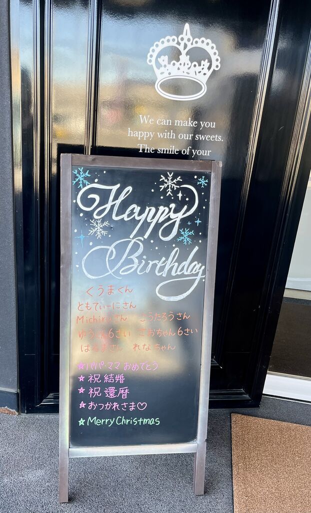 主人の還暦祝のサプライズで、主人お気に入りのこちらの生デコを予約しました。プレートに文字を入れて頂き、ローソクも数字タイプで対応して下さりました。苺がたっぷりのった生デコは、生クリームの甘さも甘過ぎずちょうど良く、スポンジもほわほわでとっても美味しかったです♪また店頭の《Happy Birthday》のブラックボードに、当日の誕生日の方の名前やメッセージがそのままで記入されてる配慮が嬉しかったです♪ (訪問:2025/12/28)