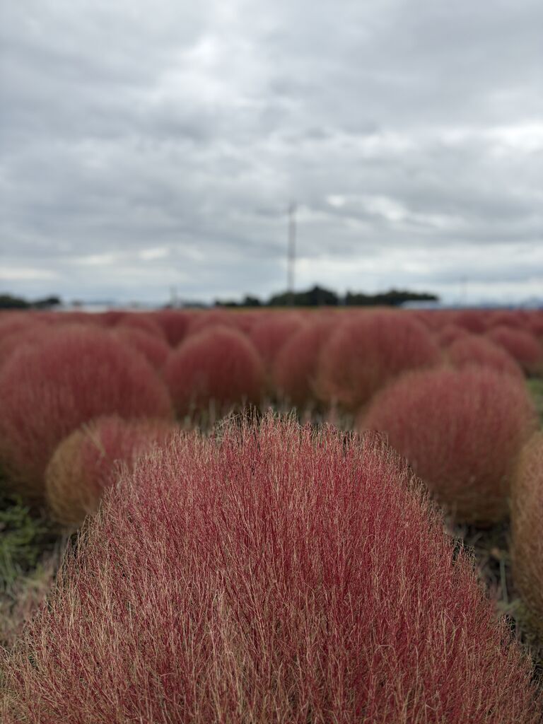 ちょっと目を離した隙に、東高橋のコキアさんが赤く色づいたらしいと聞いて、急いで行ってきました。8月末に訪れた時は緑色でしたが、もう完全に色づいて、一部は茶色くなりかけているくらい。やっぱりコキアは紅葉時期が人気らしく、たくさんの方が眺めたり写真を撮ったりと楽しんでいました。 (訪問:2025/09/23)