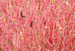 ようやく暑さも収まったかと思いきや、今日も暑い。 そんな中、芳賀町の田んぼの中にある コキア畑を訪ねてみました。 まだみずみずしい 緑の葉っぱを想像していってみると、なんと既に色づいています。 あれ、去年より色付きは早いのかと思って 見てみるとなんと 同じ日でした。 若干今年の方が 色付きは早いようです。 コキアの葉は美味しいのか 青虫たちが一杯 遊んでいます。 (訪問:2025/09/16)