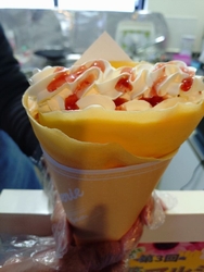 またまた、リベルテにて、美味しい創作クレープをいただきました。今回は、いただいた美味しい創作クレープについて、お話をしたいと思います。いただいた美味しい創作クレープは、写真に掲載しました通り、ホイップクリーム2倍、バニラアイス、イチゴソースを組み合わせたクレープです。ホイップクリーム、バニラアイス、イチゴソースのそれぞれの美味しさが重なり、最後の一口まで美味しくいただけました。まるで、フルーツパフェのようなクレープで、フルーツパフェ以上に美味しいクレープでした。皆さんも、是非、食べてみてください。今回も読んでいただき、誠にありがとうございました。 (訪問:2026/01/24)