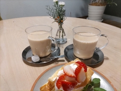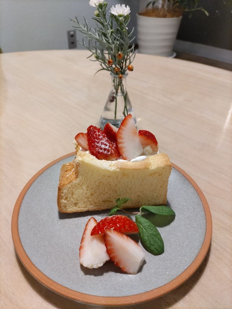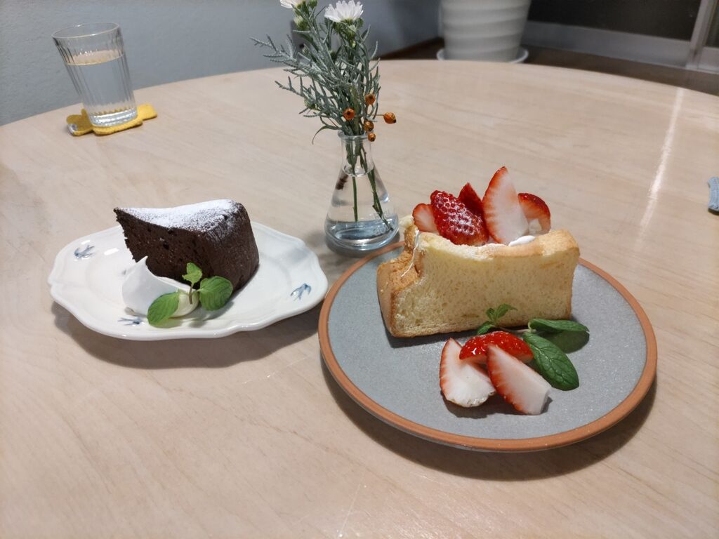 仕事を早く切り上げ美味しいケーキをいただきに伺いました。子どもはガトーショコラ、私はいちごのシフォンサンドです。飲み物はお気に入りのティーオレでホッとひと息。早くもいちごの季節がやってきましたね。とてもフレッシュで、ふわふわのシフォンと濃厚な生クリームと一緒に食べると贅沢すぎる〜。短い時間でしたが、安らぎに感謝です。 (訪問:2025/11/19)