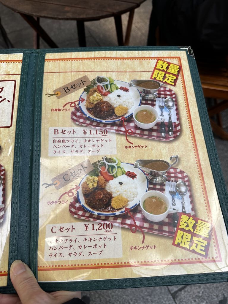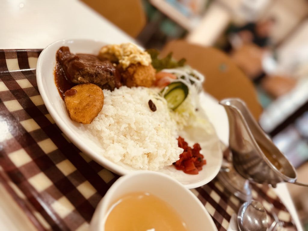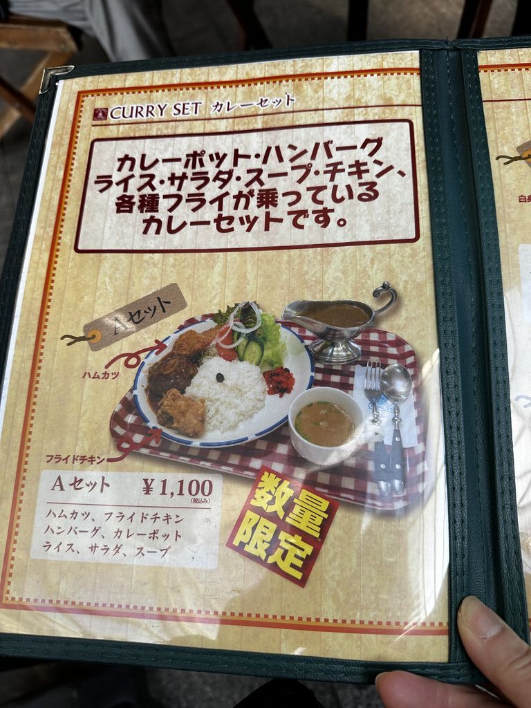 レトロな外観、いつも人がいて、気になっていたお店です。行ったときも満席で、きっとおいしいお店なんだろうとワクワクしました。悩んで頼んだのはAセットです。カレーはついついぱくぱく食べ進めてしまう美味しさで、ハムカツやハンバーグ、フライドチキンそれぞれに合っていて最後まで楽しく食べられました!お邪魔した日はカツカレーを頼んでいる人が多かったので次はカツカレーを食べてみたいです。 (訪問:2024/01/24)