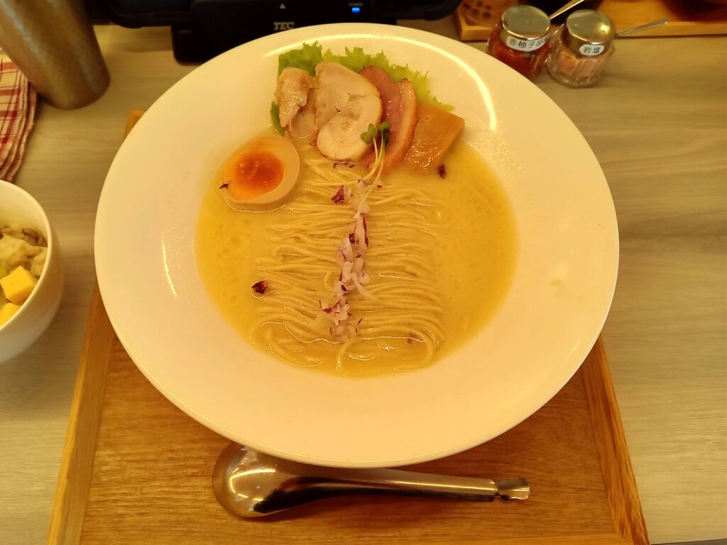 前回はつけ麺を食べたので、今回は鶏白麺(大盛り)と餃子を注文。ラーメンの麺は全粒粉細ストレートでパツッとした食感、スープは鶏の旨さのみ抽出したようなクリーミーなのにスッキリ甘みを感じる出来栄えです!トッピングは煮卵・鴨チャーシュー・ロース鶏チャーシュー・角切りシナチクでした。鴨は燻製した香りがしっかりしています。鶏チャーシューはしっとり食感、角切りシナチクはサックリ柔らかな口当たりで、トッピングの出来も良いです。餃子は焼き小龍包に近い感じですが、肉汁と餡の味わいが気に入りました。 (訪問:2025/09/24)