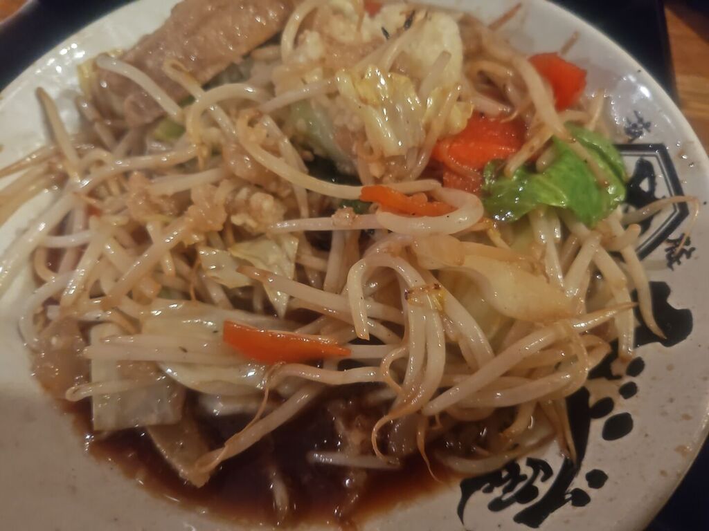 野菜の日に本店で食事していただいた定食券があったのでこちらの店舗で使用しました。野菜炒め定食の醤油でトッピングに紅生姜を追加。野菜と背脂をマシにしました。定食のスープがこの日はなくなってしまったとのでつきませんでしたが、無料の卵とたっぷりの野菜炒めで満腹でした。卓上に唐辛子とコショウがあったので途中で味変もできました。 (訪問:2025/09/23)