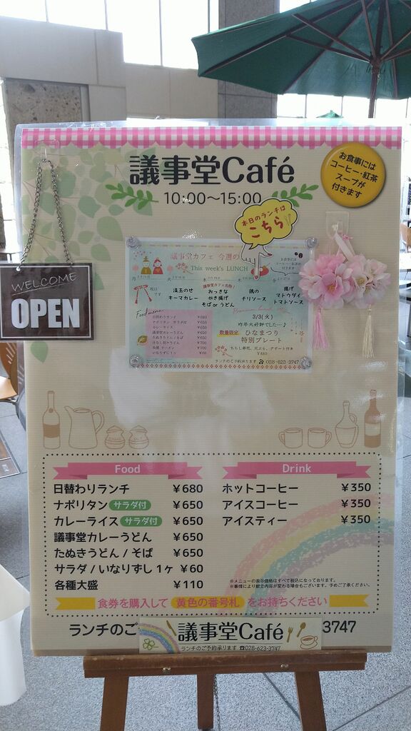 どれにしようかなぁ〜と、メニュー表としばし睨めっこ...よし!‼と決定したメニューは【日替わりランチ・¥680】です。食券を購入し、黄色い番号札を取り着席。AM11時だったのでお客様は私を含め2人。眺めの良い席で、アイス珈琲と野菜スープを飲みつつ待っていました。野菜スープの中の、もやしがクタクタに柔らかく火が通っていて、大変美味しゅうございました。ピンクのお新香とライスの上のお新香は、セルフサービスで欲張りました(笑)「すみません、付け合わせ忘れました」と後からナポリタンを別皿でいただきました。メインをナポリタンにしようかな〜と候補に選んだひとつなので、得した気分( ˘ ³˘)ホット紅茶も最後にいただきました。栃ナビメンバーさんだけのお得なクーポン『デザートサービス』のアイスを添えて...3月3日のお雛様メニューが魅力的♡♡♡仕事で行けないのが残念無念。ホントに議事堂カフェコスパ最高、最強です。 (訪問:2026/02/26)