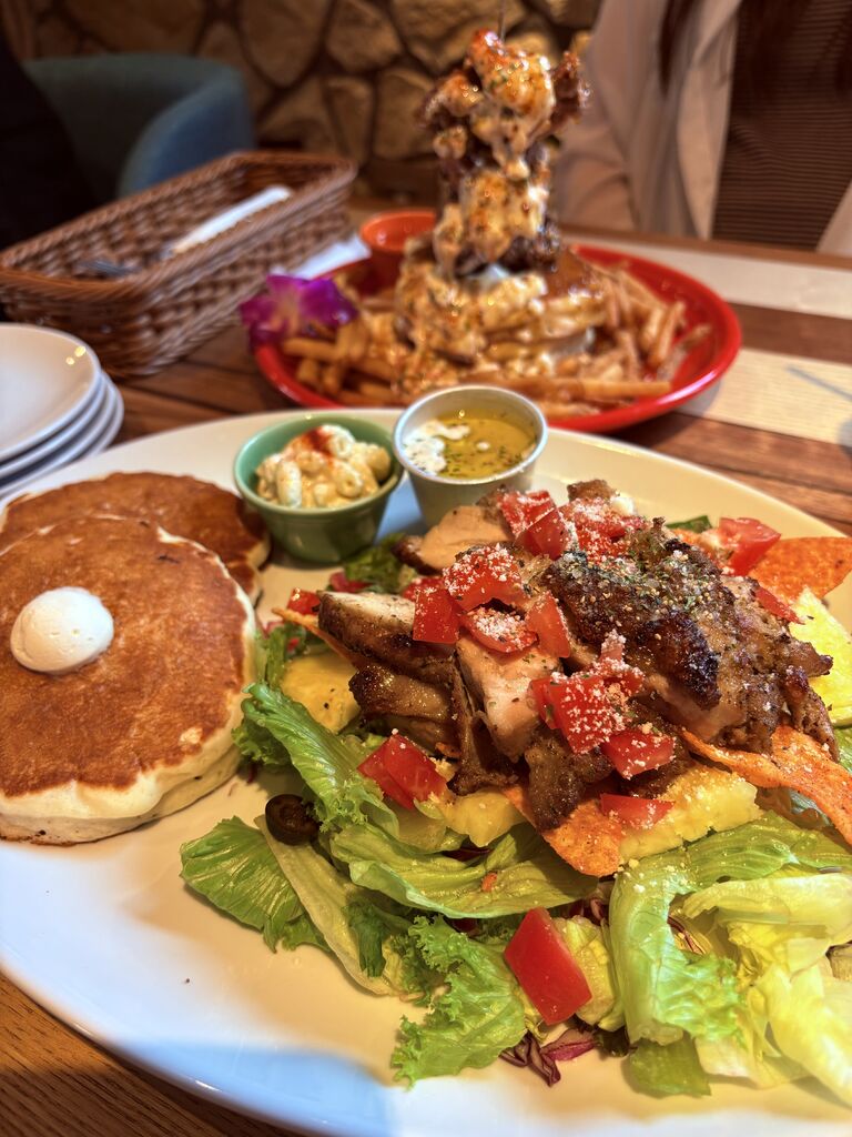 やっと訪問出来た~(笑)OPEN当時からずっと気になっていて店の前を通るたびに外まで並んでいた日々。ダメ元で行ってみよ~って事になりGO!運良く駐車場も空いていて入店~♫3組待ち位で通されました。パンケーキをメインで食べたかったので【マカダミアナッツパンケーキ】と【モチコチキン】をチョイス!パンケーキのソースは冷たいソースと温かいソースが選べて私は温かいソースをオーダー♫届いた瞬間の感想が、パンケーキがマカダミアクリームソースのお風呂に入ってるみたい(笑)と率直に思ってしまいました。パンケーキは軽い食感なので濃厚なソースとクランチマカダミアの食感が相性いい~(笑)コーヒー豆を砕いた物&ハニーシロップをかけて味変を楽しめるので最後まで飽きる事なく、ソースにパンケーキをヒタヒタと染み込ませながら食べちゃいました(ૢ˃ꌂ˂⁎)チキンはロコの定番メニューらしく(もち粉)をまぶして揚げてあり外はカリカリ、中はジューシーでやみつきになるチキン(笑)もう一品は【コズナチーズバーガー】何ともボリーミ~♫野菜たっぷりで牛肉100%、パティにチーズがとろけている姿に惹き付けられてしまい、一口パクリ!甘めのソースが全体に合っていて食欲そそる~。気づいたら彼は完食していました~(笑)ポテトはカリカリ、パリパリ食感。ドリンクメニューも豊富で選びきれなぁ~い!次は他のパンケーキを食べてみたいと決定しました٩(ˊᗜˋ*)و (訪問:2025/09/09)