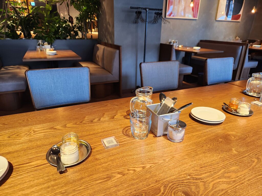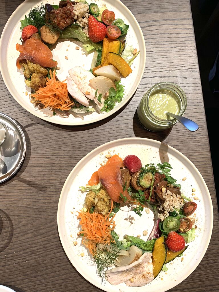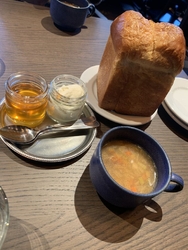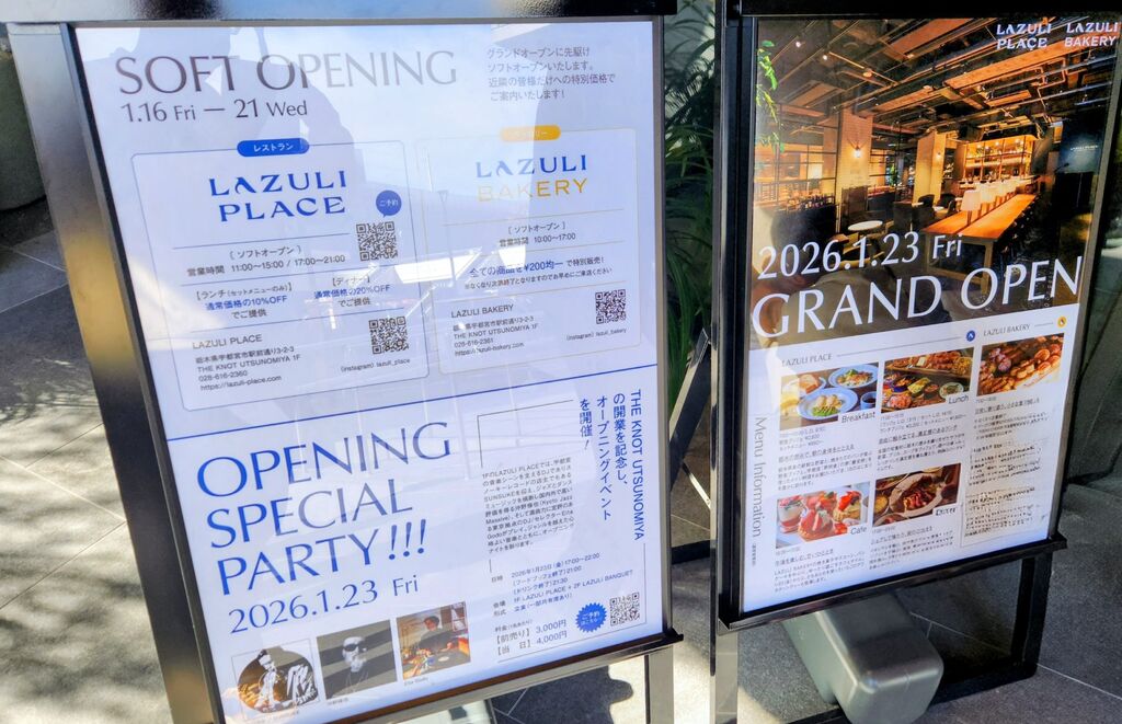 NEWチサンホテル跡地に出来たTHE KNOT UTSUNOMIYAの1階に1/23にグランドオープンするLAZURI PLACEさんがソフトオープンとのことでランチに行ってきました。モバイルオーダー制でリースサラダを注文。パン、スープ、ドリンクが付きます。まず出てきたパンは同じく1階に同時オープンするLAZURI BEKARYさんのプレミアムブレットが焼き立てで提供されます。2人で行ったので1斤を二つに割って。焼き立てなのでそのままでももちろん美味しいですが、卓上にホイップバターとはちみつが用意されているのでそちらを付けても楽しめます。リースサラダは玉ねぎと大葉の生ドレッシング、タヒニドレッシング2種類から選べます。サラダは鶏ハムやサーモンがのっていてざっと数えても10種類以上の野菜が色とりどりで目にも鮮やか。ドレッシングは塩味が強すぎないのでたっぷり掛けて。野菜の色々な触感が楽しめてサラダでも十分な満足感がありました。開放感のある大きな窓と店内のグリーンが綺麗でした。今度は別のメニューを食べに行きたいです。 (訪問:2026/01/18)