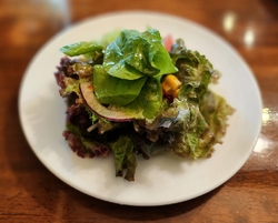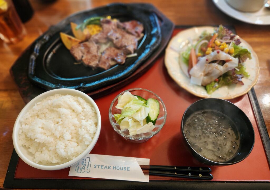 今日はステーキの気分だったので前から気になっていたこちらに初訪問です。注文は「牛ヒレ1口ステーキ御膳 3,380円」「サラダ 330円」「レモンティー 500円」柔らかくて肉の旨味が凄いです。御飯付きと聞いていましたがサラダ、お新香も付いていたのでサラダがダブってしまいました。 (訪問:2025/09/21)