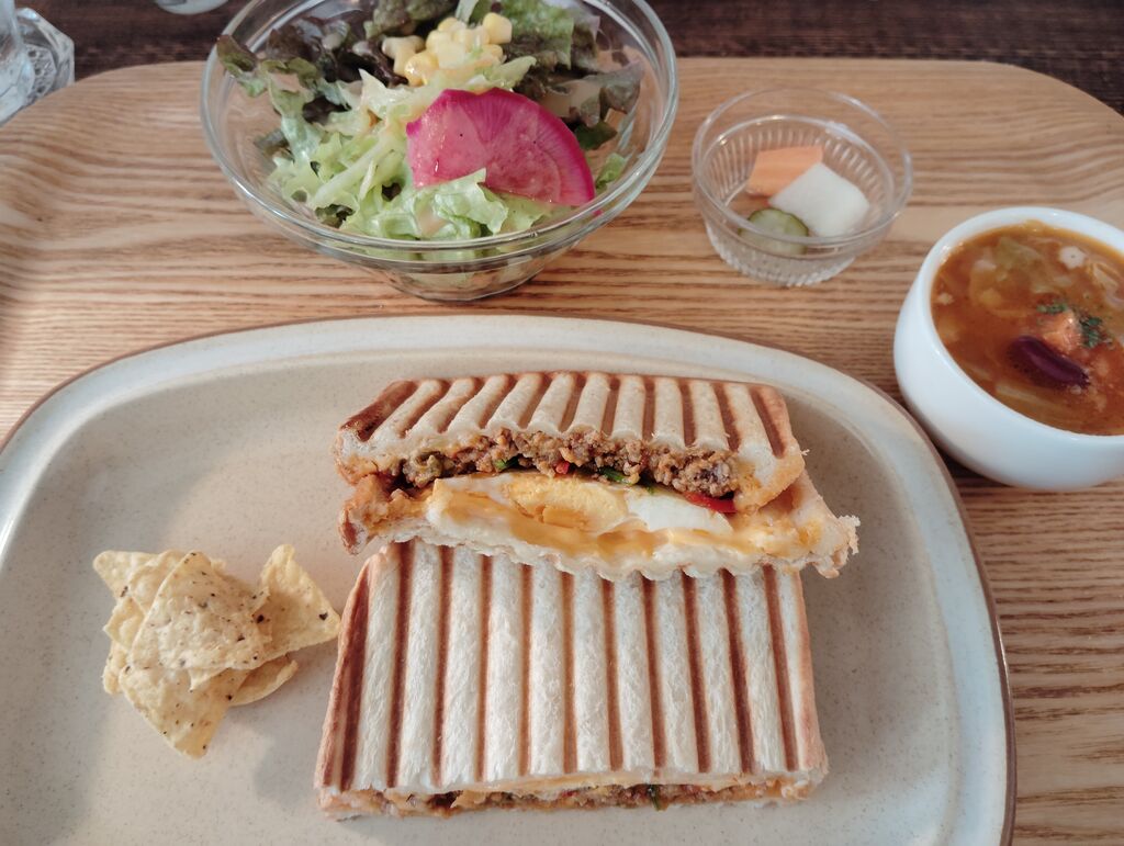 ランチでホットサンド(タコスチーズ)セット1000円をいただきました。ん~美味しい♪具たっぷり、卵も入ってます!サラダ、スープ、ドリンクも付いてバランスもgoodです☆店員さんも店内も温かみがあって居心地イイです(^-^) (訪問:2025/05/01)