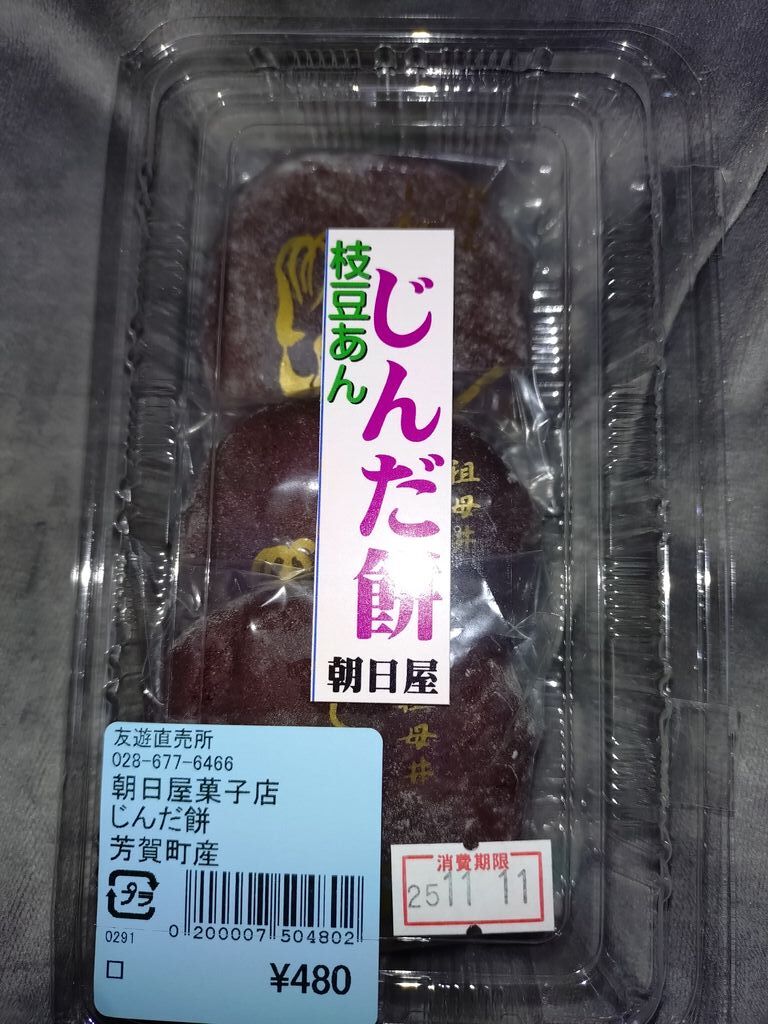 雨で寒かったけどジェラートが食べたくて、抹茶と梨ミルクを購入。梨ミルクは芳賀町産の梨が入ってミルクが濃厚で美味しかったです。直売所で祖母井 朝日屋さんの「じんだ餅」を購入。黒いお餅で中は鮮やかな枝豆の緑色のずんだ餡。甘さ控えめで、柔らかくてとても美味しかったです。 (訪問:2025/11/09)