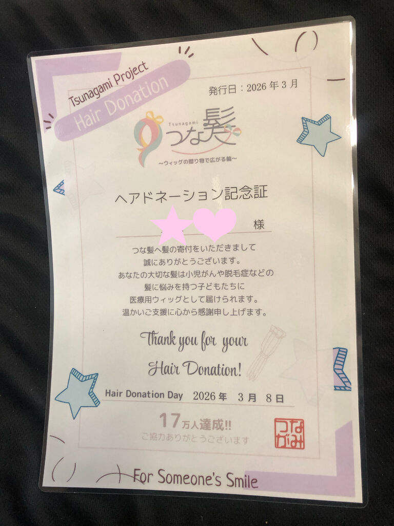 ヘアドネーションをするために来店しました。とても親切な対応でした。カットだけと思っていたら、シャンプーまで丁寧にしていただきました。初めての来店の美容室だったので緊張していましたが、フレンドリーに話しかけてもらってよかったです。写真撮っていいですかって聞いたところ、撮りましょうかって言ってくれて嬉しかったです。ヘアドネーションの料金も4,950円+送料600円と合計で5,550円とリーズナブルでしかもゾロ目笑嬉しいなにかいい事あるかもって思っちゃいました。その後、ヘアドネーションの認定証が届きました。認定証をいただくとヘアドネーションした実感があり、とても嬉しく思います。ありがとうございました。また、ヘアドネーションする機会がありました時にはよろしくお願いいたします。 (訪問:2026/03/08)