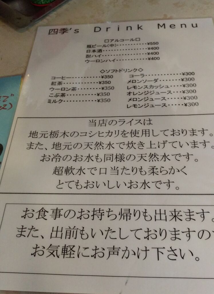 お得なランチを食べに、鹿沼市で有名な四季さんに来店。ひらめフライと四季ポークを注文いたしました。四季ポークは、ポークをカツレツにしたような感じでぴり辛でとても美味しいです!ここでしか食べられないそうですので、是非!お店のお父さんとお母さんもとても人当たりが良く、実家のような安心感があります。ほかにも色々メニューがあるので、また是非いきたいです。 (訪問:2022/06/10)