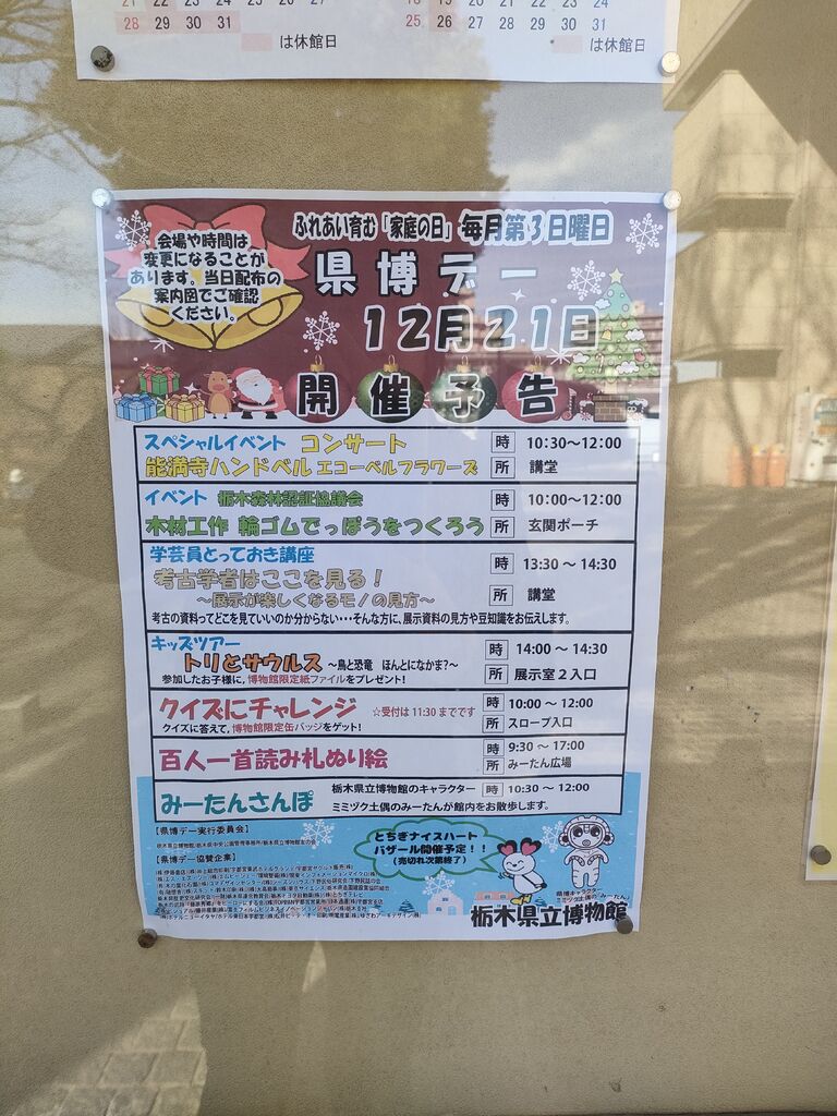 昨日ルンルン気分で子供と博物館に入ろうとしたところ、、ガビーン休館日だっぺな~。思わず訛ってしまいました。そりゃ職員さんもお休みしないとね!と自分に言い聞かせ、また子供と行ってみようと思いました。皆様は私のようにならないように(笑)事前に公式HPやSNSをチェックしてから行く事をオススメします。今月の県博デー(博物館のイベント)は12月21日(日)だそうです^_^ (訪問:2025/12/08)