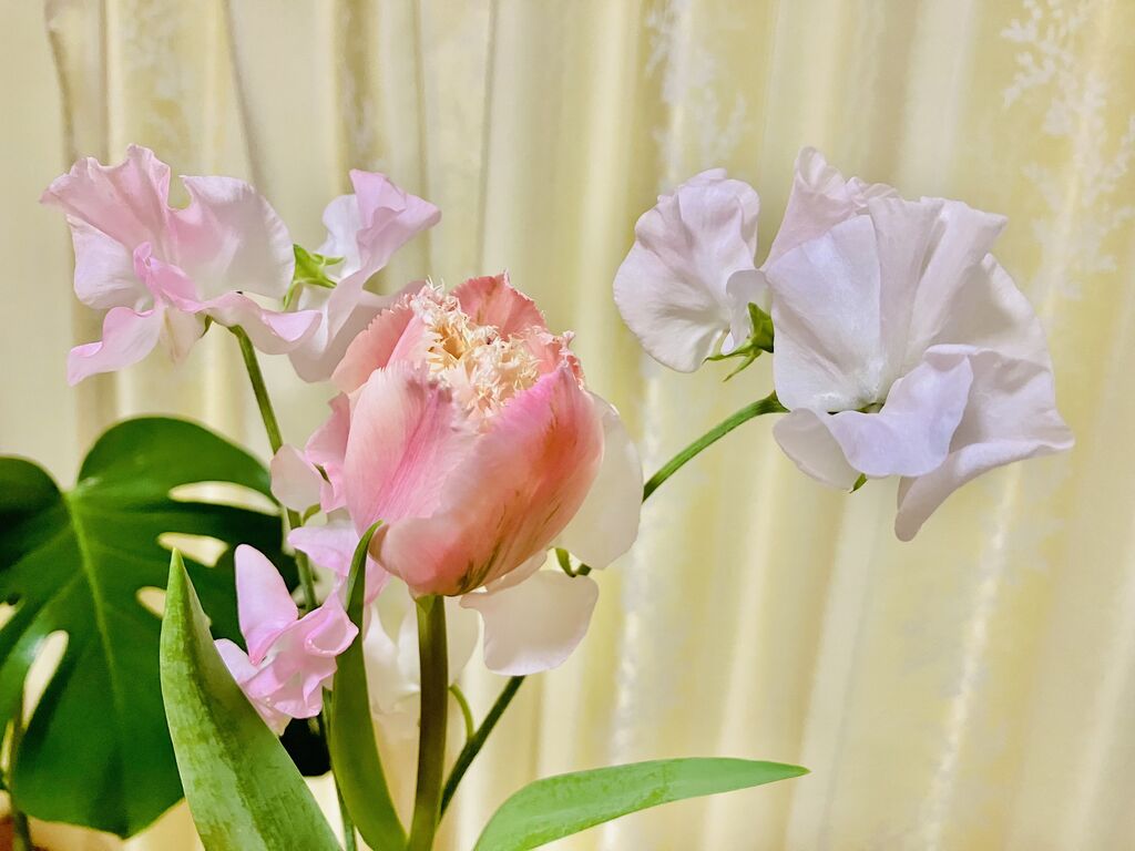 ちょっと変わった種類のチューリップとスイートピーを購入しました。スイートピーは、そろそろ見納め時かな?と思い今のうちに^_^甘い香りに癒されてます(ღˇ◡︎ˇღ)《カジュアル》 (訪問:2026/03/21)