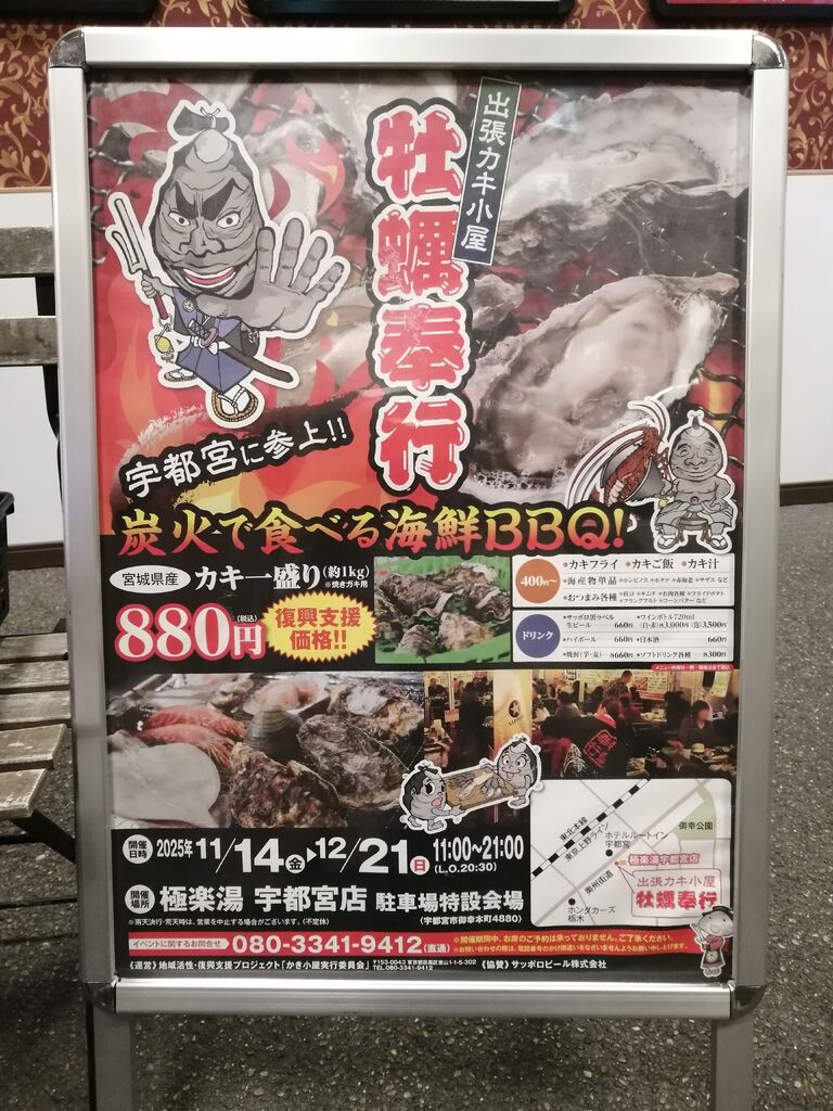今日のお目当ては【極楽湯】さんの駐車場特設会場で開催されている《牡蠣小屋》です。毎年この時期になると恒例のようでたくさんのお客さんで賑わっていました。炭火焼きの良い匂いが漂っています。《牡蠣小屋》に来たからには[焼き牡蠣]を食べたいところですが私も友人も焼き牡蠣が食べられない(> <。)…なので牡蠣汁と牡蠣フライと海鮮BBQです。海鮮の他にも鶏・豚・牛肉やフランクフルト、鮭のはらみ、、コーンバター、ポテト、唐揚げ、ドリンクなどのメニューも充実しています。トレーに焼きたいものを取って前払いをしたら(1グループ1会計。個別会計はできません)BBQスタート!制限時間はありません。外は寒いけど焼いて食べてるとあったかいです。周りを見渡すとやはり皆さん牡蠣を焼いて美味しそうに食べていますね~。そりゃそうですよね~。でもでも牡蠣汁も牡蠣フライも美味しかったですよ♡期間中にまた行きたいな~♪ごちそうさまでした•ᴗ•ꕤ* (訪問:2025/11/19)
