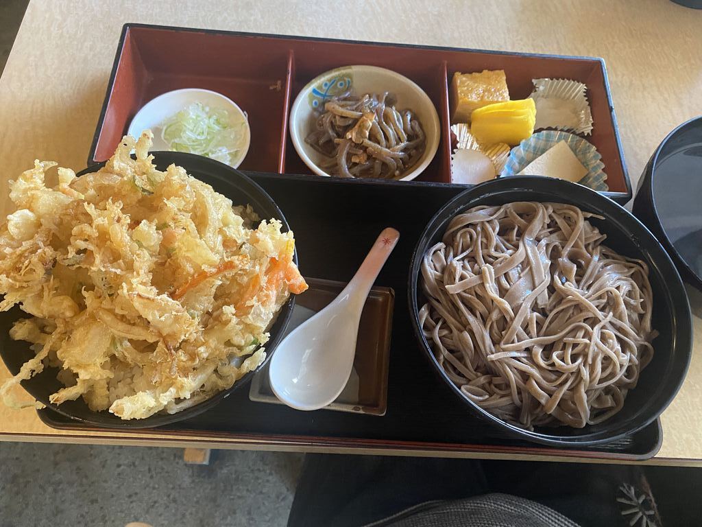 2人でランチ訪問しました。2人共かき揚げ天丼セット980円を。蕎麦、天丼、温かい付け汁、タマゴ焼き、こんにゃくとシジミの煮物、高野豆腐、沢庵、みたらし団子がセットになっています。ボリューム満点、コスパ最高の極旨ランチでしたが、食べきれずパックを頂いて夕飯に。居心地が良くアットホームなお店で、女将さんも接客が凄く優しいです。美味しくてまた行きたくなるお店です。 (訪問:2025/12/05)