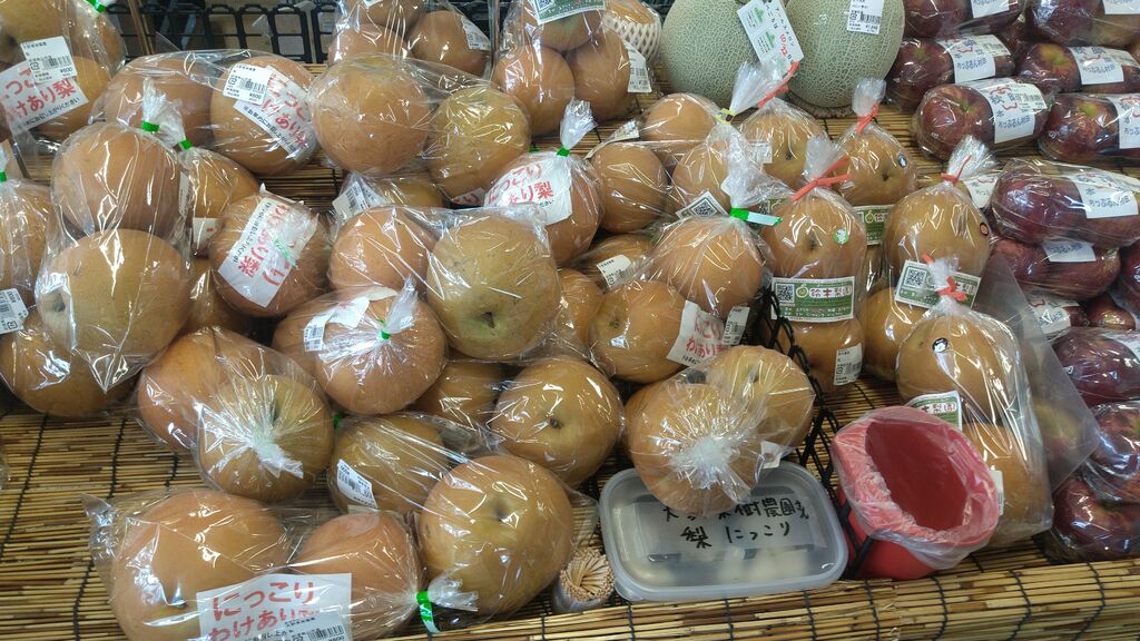 梨の大玉品種「にっこり」が売っていました。訳ありのものが安く買えたので家庭用に買って帰りました。甘くてみずみずしくて、美味しかったです。 (訪問:2025/10/13)