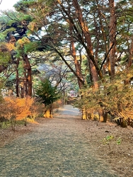 大分、寒くなりましたが、未だ未だ紅葉が楽しめます。丘をダラダラと登る参道の左右の斜面が、赤や黄色の葉っぱで色付いて見えます。参道は赤松が多いので紅葉はしていませんが、落ちた茶色の落ち葉が絨毯の様にふかふかしていて、この足の裏の感触で秋を感じます^_^ (訪問:2024/12/05)