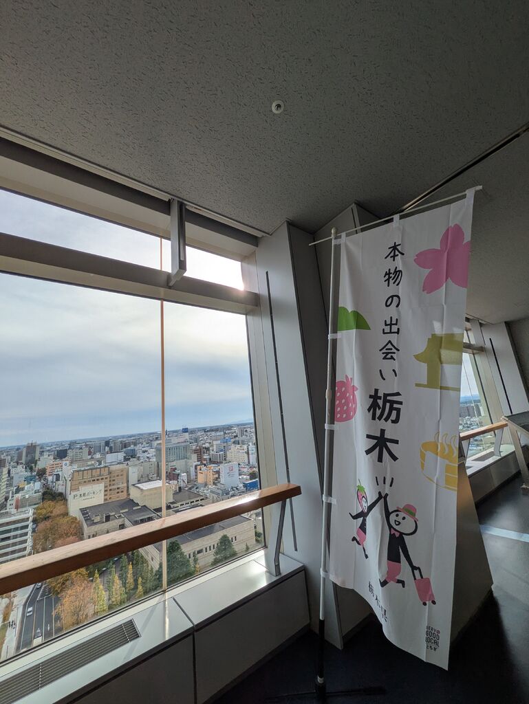 地下の駐車場に車を止めてエレベーターで一気に15階へ!遠くの山々から近くの建物までよく見えます。天気が良かったので気持ちがいいです。ロビーにはイチゴ王国の案内や伝統工芸の展示なども。栃木県民ならみんな歌える県民の歌も。 (訪問:2025/11/05)