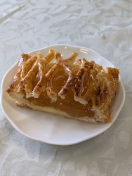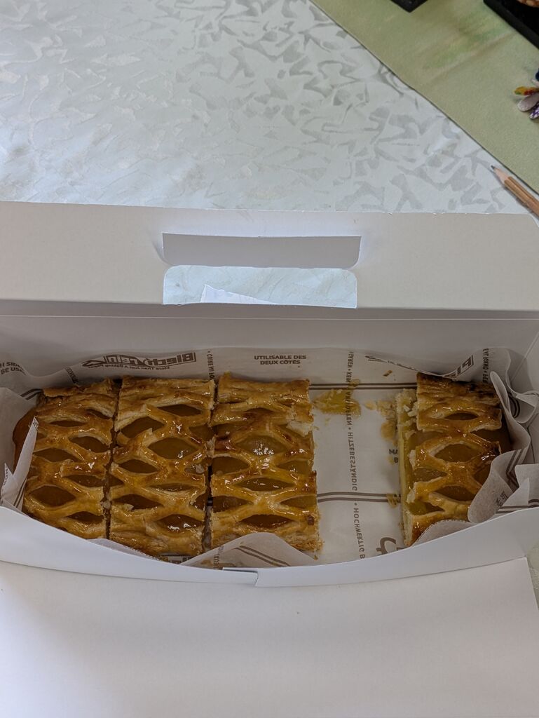 お客さんからの差し入れで頂きました。5等分にカット。1切れに半分のリンゴがゴロッと!カスタードと杏ジャムが入っていて酸味と甘みが抜群!2切れでも余裕で食べられそうです(笑) (訪問:2025/12/29)
