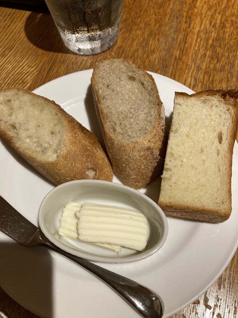 「仔羊のステーキ120g」(1880円)を食べました。サラダ、ライスorパン、三年晩茶がセットになっています。サラダにかけるドレッシングは2種類提供され、好みで好きな方をかけられます。パンはバケット、ライ麦パン、食パンの3種盛りでした。ラム肉はクセがなく食べやすかったです。 (訪問:2025/11/22)