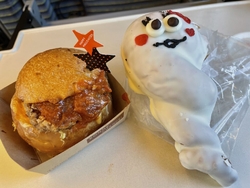 今週はハロウィンウィークですね。ハロウィン限定のパンがズラリ。こう云うのを見るも思わず買ってしまいます。今日は、ガーリックトマトハンバーガーとオバケツイストですら、ハンバーガーはガーリックが効いていて、肉厚のパティが旨い。トマトの酸味でサクッと食べられます。小振りながらなかなかの旨さ。オバケツイストは、カスタードクリーム入りのツイストドーナッツ。グレーズに覆われていて、可愛いデザイン。何方もハロウィンならでは^_^ (訪問:2025/10/27)
