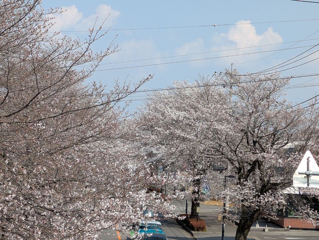 まだ満開にはあと少しという感じですが、やはり今年も車がゆっくりと走りちょっと渋滞気味になっています。暖かくて桜を見るにはにはちょうどいい天気で、買い物がてらのお花見です。 (訪問:2026/03/29)