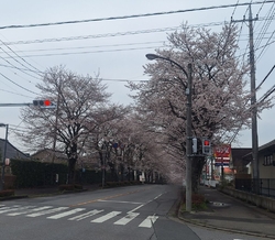 満開の桜に雨が当たって道路沿いに桜の花びらが落ちていました。季節はいよいよ春本番ですね。この街にもようやく厳冬の冬が去り、暖かな春を向かえた証拠です。季節の移り行く様を見て、やはり、どんなに厳しい冬も、辛抱強く待てば、かならず暖かな陽光に溢れた春となるのです。 (訪問:2026/04/04)