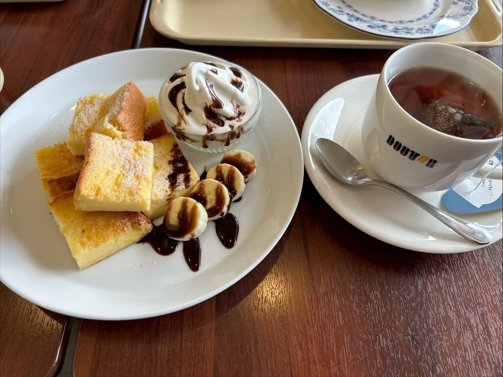 フレンチトーストチョコバナナを食べました。ほどよい甘さで美味しかったです。フレンチトーストが小さくカットされていたので、食べやすかったです。今度は違うメニューを食べてみたいです。 (訪問:2025/10/08)