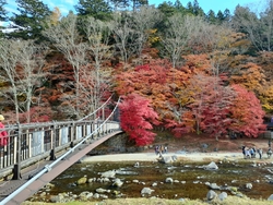 紅葉が見たくて行ってきました。たくさんの観光客が来ていて、赤や黄色に色づいた木々を楽しんでいました。吊橋を渡ると遊歩道があり散策も楽しめます。一緒に行ったワンコの散歩にちょうどよく、川沿いを歩いたりしました。 (訪問:2025/11/02)