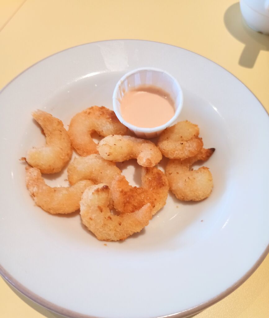 ポップコーンシュリンプとソーセージのピザ、ドリンクバーを注文しました。ポップコーンシュリンプは小さいサイズのエビがたくさん入っているのでシェアしてつまむのにもちょうどいいです。衣に味がついているので、そのまま食べても美味しいです。 (訪問:2025/08/12)