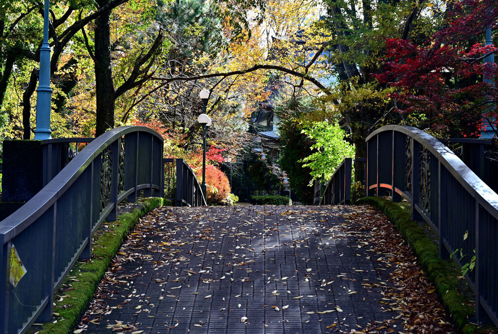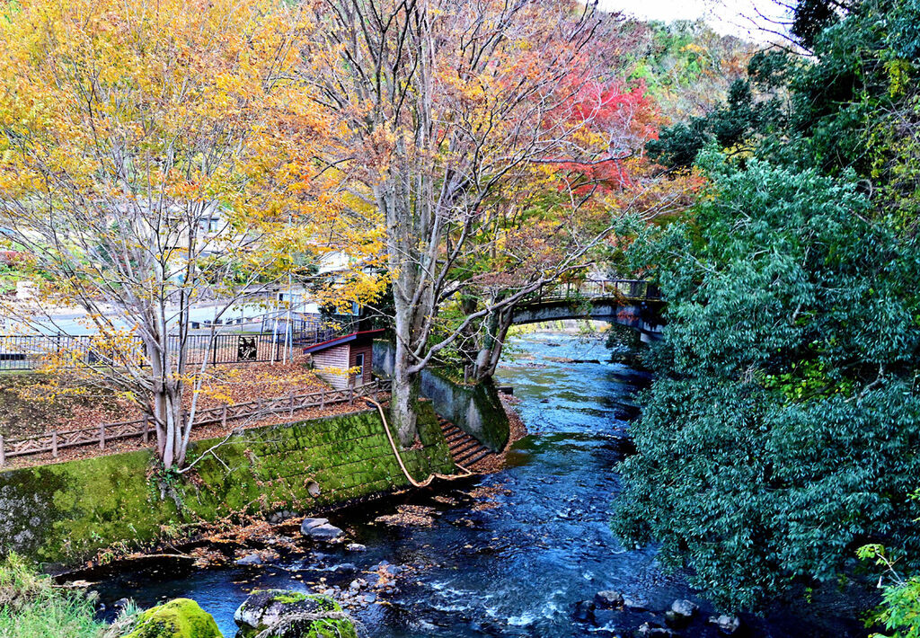 大蛇が棲むという伝説があり、その名の由来となった「龍門の滝」へ行ってきました。駐車場から滝へ向かう道すがら、2本の橋がかかっていますが、そのうち歩行者専用の「蛇姫橋」周辺はちょうど紅葉が見頃。落ち葉を踏みしめながら階段を降りていくと、目の前には迫力ある龍門の滝の景色が広がります。 (訪問:2025/11/10)