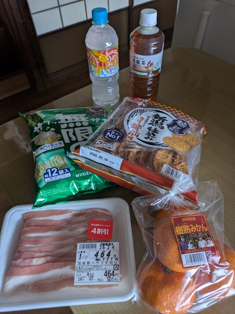 飲み物が欲しくて寄りました。店内ウロウロすると豚肉が安かった!夕方また買いに行こかな〜。お煎餅は売り出しでした。ラッキー! (訪問:2026/02/02)