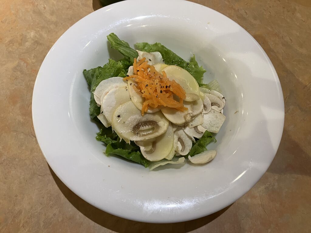 夕飯を食べに行きました。マッシュルームサラダ初めて食べましたが、ドレッシングとよく合って美味しかったです。ハンバーグはソースたっぷりかけていただきました。ご飯がめちゃくちゃすすむので、お代わり自由は嬉しいサービスです。ご馳走様でした。 (訪問:2025/09/22)