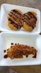 カレー風味のコロッケを2つと鳥のささみのフライを購入して、道路を挟んだ店舗で揚げたてを食べました。コロッケも美味しかったけど、タレをかけていただいた、ささみのフライとても美味しかったです! (訪問:2025/05/03)