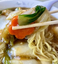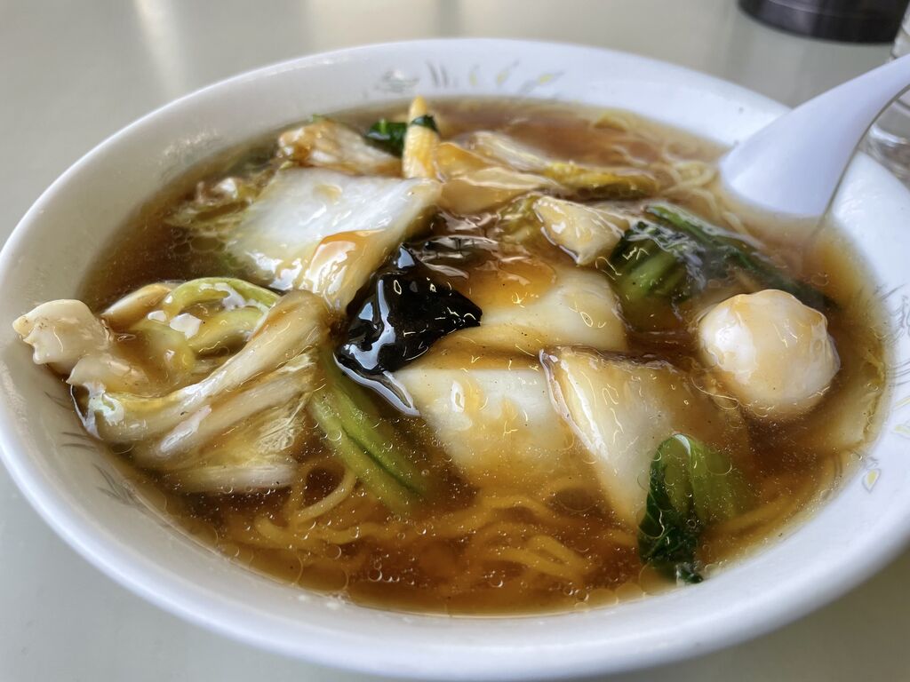 久々の訪問です。ここの中華は日本と中国の家庭料理だそうです。日本で言うと街中華かな。今日は五目ラーメン。醤油ベースの肉野菜炒め餡掛けです。少し甘めの醤油味のスープ。優しい、どこかホッとする味。肉野菜炒めの餡掛けがこれまた旨い。これらがストレート細麺に絡んで旨い。店の入口には可愛いマスコットのコックさんが居ますよ^_^ (訪問:2026/02/05)