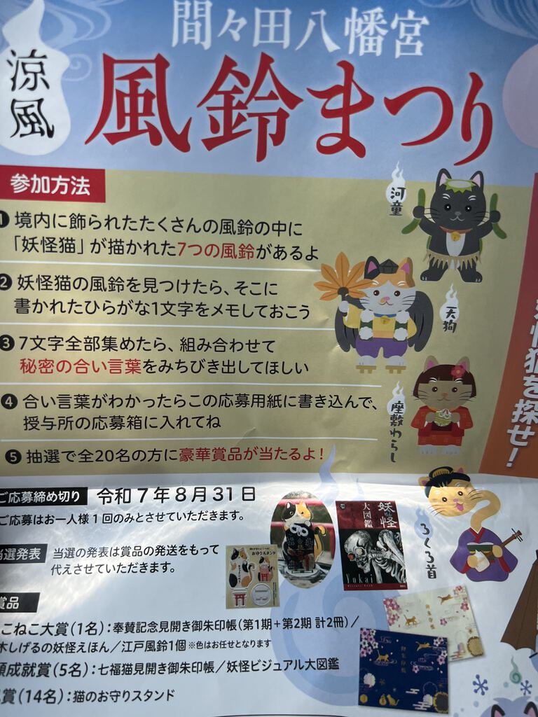 風鈴まつり境内あちこちで風鈴の心地よい音が鳴ってました沢山の風鈴の中から、文字のある風鈴を探し出し、文字を組み合わせてクイズを解くイベントも行われていました(๑°༥°๑)毎年5月5日に行われる「じゃかまいた祭神」にもお参り無病息災、五穀豊穣 (訪問:2025/07/21)