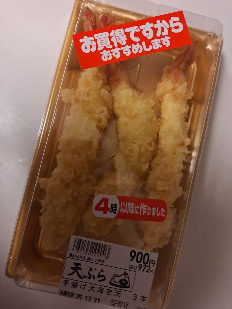 大晦日の夕方に年越しそばの海老天などを買いに行きました☆元日はお休みなので、1月2日まで持つのに45%割引になっている物が多数あり、安い!と言いながら次々カゴに入れました♪15時や16時以降に作られたお惣菜もあり、揚げたて天ぷらがサクサクで美味しかったです(^ー^) (訪問:2025/12/31)