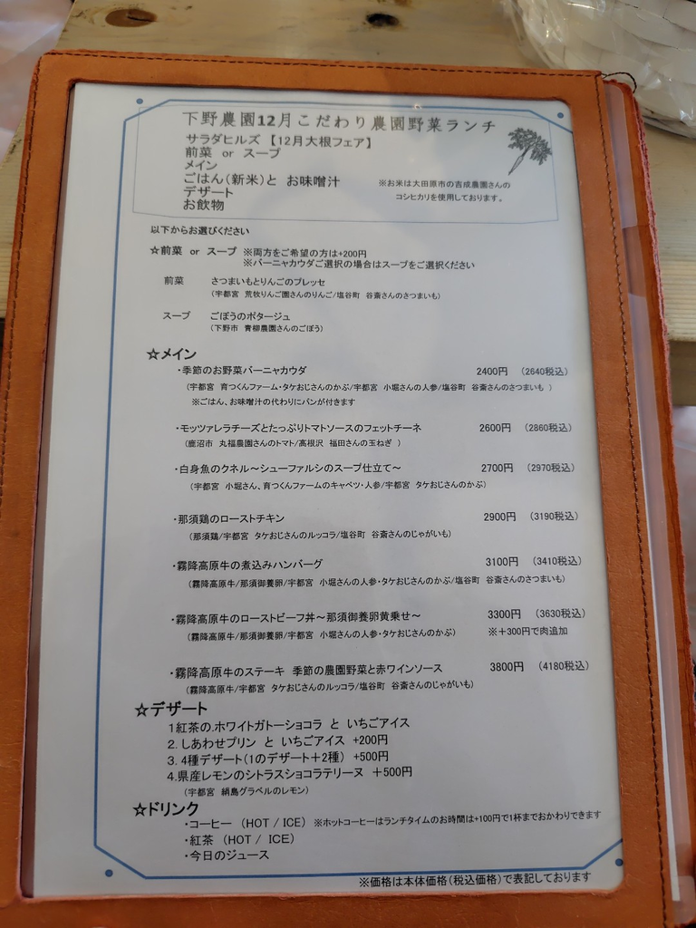 お気にいりの下野農園さんに、予約して友人とランチに伺いました!今月のサラダバーは、さつまいもです!メインを選び、前菜、サラダバー、ライス、味噌汁、飲み物、デザート付きです!前菜を蓮根と那須豚のムーステリーヌ、メインをサワラのポワレ、デザートはほうじ茶のブラマンジェとりんごのコンポートとミルクジェラート、そしてコーヒーを選びました!サラダバーは、色々なさつまいものお料理で、グラタン等も有り、満足感あります。メインのポワレは、魚がふっくらして、優しいお味の美味しさでした!お味噌汁に野菜たくさん入っていました!デザートも美味しく、友人と話も弾み、ゆっくり楽しくランチを頂く事が出来て、良かったです!入り口出た所には、新鮮なお野菜が販売されています!色々なお野菜、食材にこだわれて作られている感が伝わります!色々なサラダバーを頂け、美味しいメイン、デザート等々、充実したお食事を、いつもありがとうございます!ごちそうさまでした!また楽しみにお伺いします! (訪問:2025/11/19)