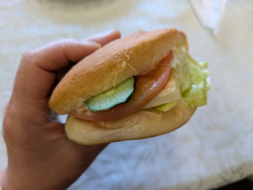 お昼に、とお客さんから差し入れです。チーズサンド、卵ドッグ、あんドーナツを頂きました。厚切りチーズとレタス、トマト、きゅうり。独特な硬さのパンが美味しいチーズサンド!揚げて有るのにペロリと食べられるあんドーナツは中の餡が美味しい!「ふかふか、柔らか〜、モッチモチ」では無いのに何故か美味しいパンです。 (訪問:2025/11/22)